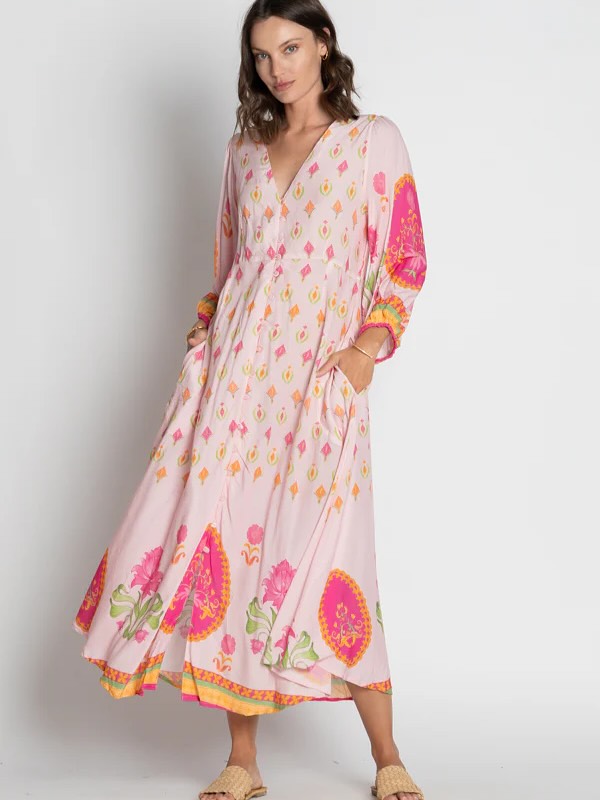 The Lula Soul Ladera Midi Dress takes the same gorgeous print and soft fabric you love from the short Ladera and gives it a flowing midi silhouette. Designed with a flattering V-neckline and mandarin collar, it blends relaxed charm with a touch of polish. The short sleeves make it easy to wear on warm days, while the tiered skirt adds graceful movement. With side pockets for everyday practicality, this dress is as functional as it is beautiful. 🩷