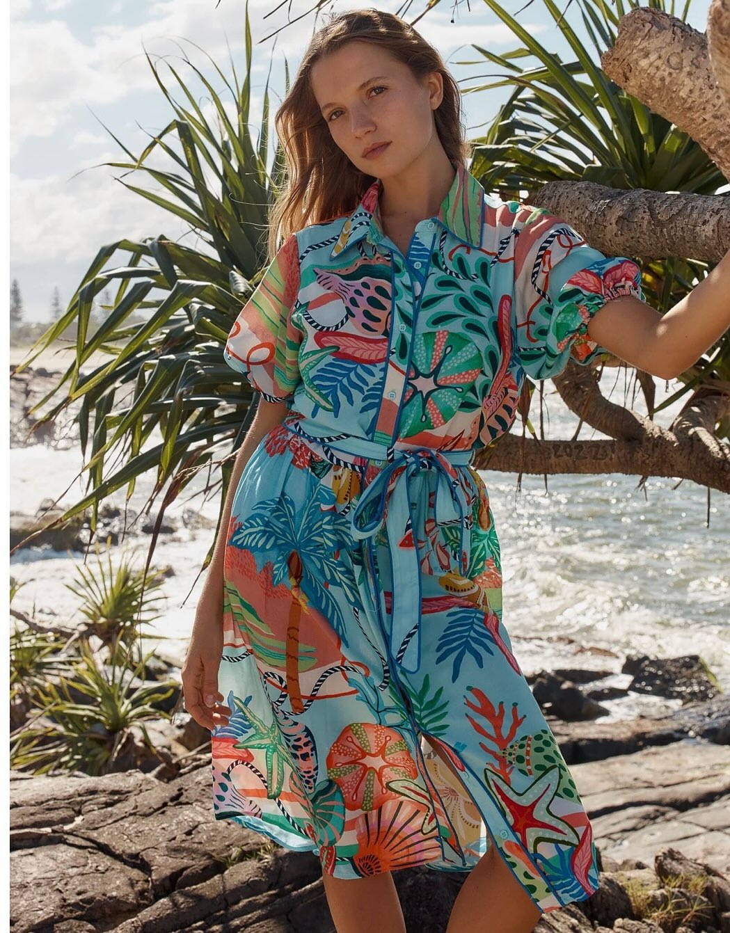 Step into effortless elegance with the Naudic Sao Paulo Dress in Tangier print. crafted from 100% viscose, this lightweight , breathable dress drapes beautifully, offering comfort and style for warm weather days. the Tangier print bursts with vibrant florals and intricate detailing, creating a standout look that moves seamlessly from resort wear to everyday chic. featuring a relaxed silhouette, short sleeves, and a softly gathered neckline, its designed for easy feminine wear.