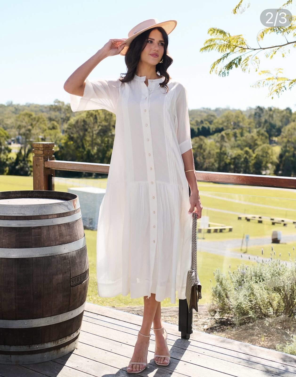 The Rubyyaya Warbler Shirtmaker blends timeless tailoring with effortless charm. Crafted from 100% cotton, this classic shirtmaker dress features a flattering curved hem, elegant ¾ sleeves, and eye-catching pearl and diamante buttons for a touch of sparkle. Designed in Australia and made in India, this versatile piece can be styled up or down for any occasion. Easy to wear and care for, it’s the perfect blend of comfort and sophistication. 🩷 🐦